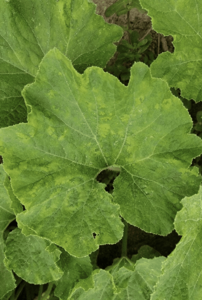 家庭菜園でかぼちゃを栽培していると、葉っぱにモザイクのような模様が現れることがあります。これはモザイク病。放っておくと株全体が縮んだような状態になってしまうこともあります!