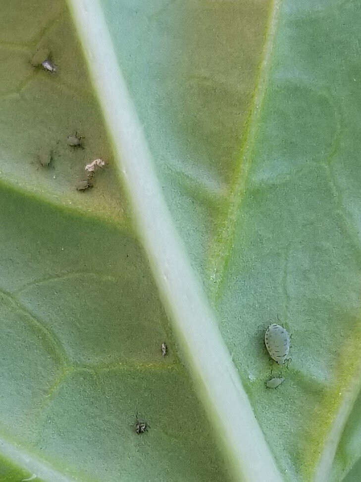 アブラムシは、成虫・幼虫ともに、ダイコンの葉っぱを食べます。アブラムシと一口にいっても、いくつかの種類がいて、なかでもダイコンに寄生しやすいのは、ダイコンアブラムシ、ニセダイコンアブラムシ、モモアカアブラムシなどです。