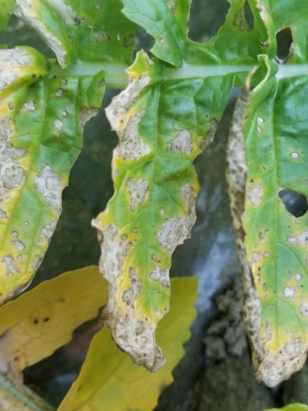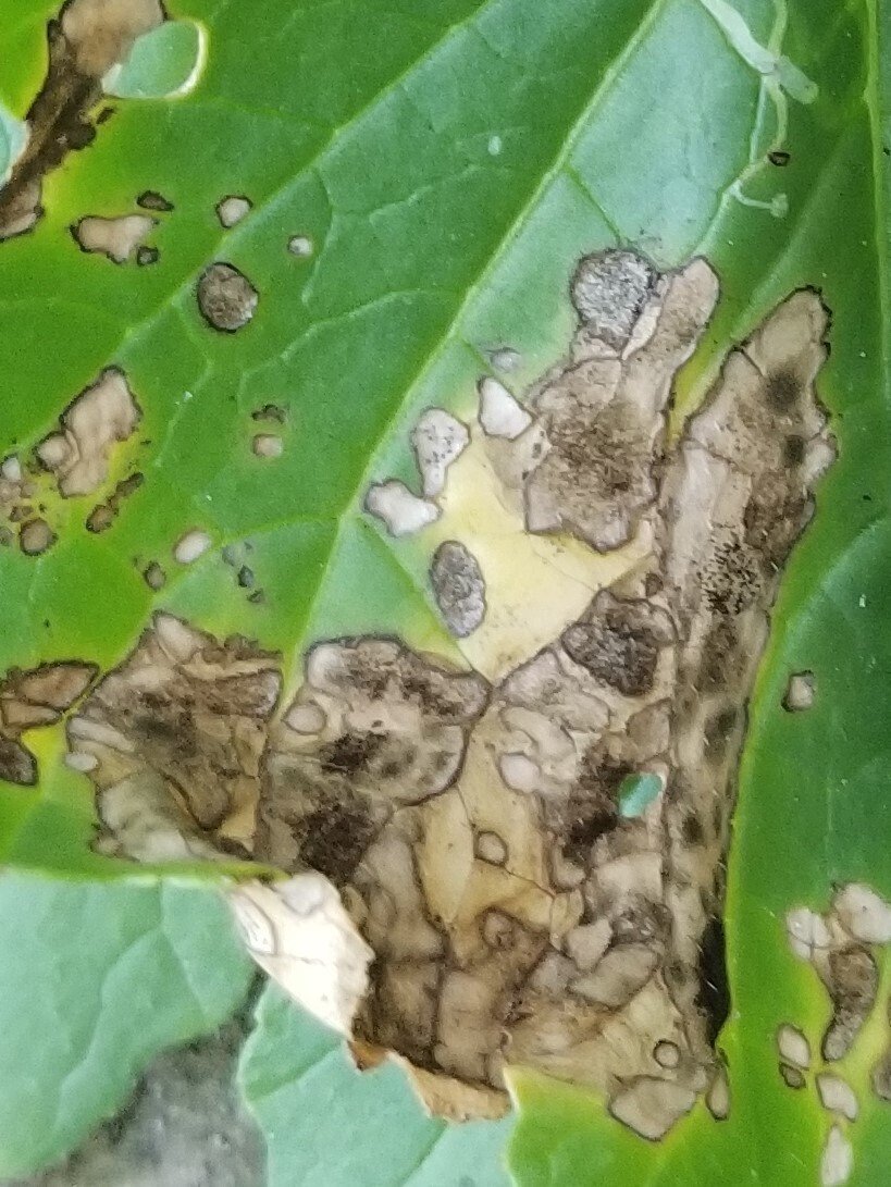 その後、どんどんと大きくなっていき、くっきりとした黒褐色でふち取られた灰色の病斑になります。写真を見てもらうと分かる通り、葉っぱのかなりの部分が枯れてしまうことになります。