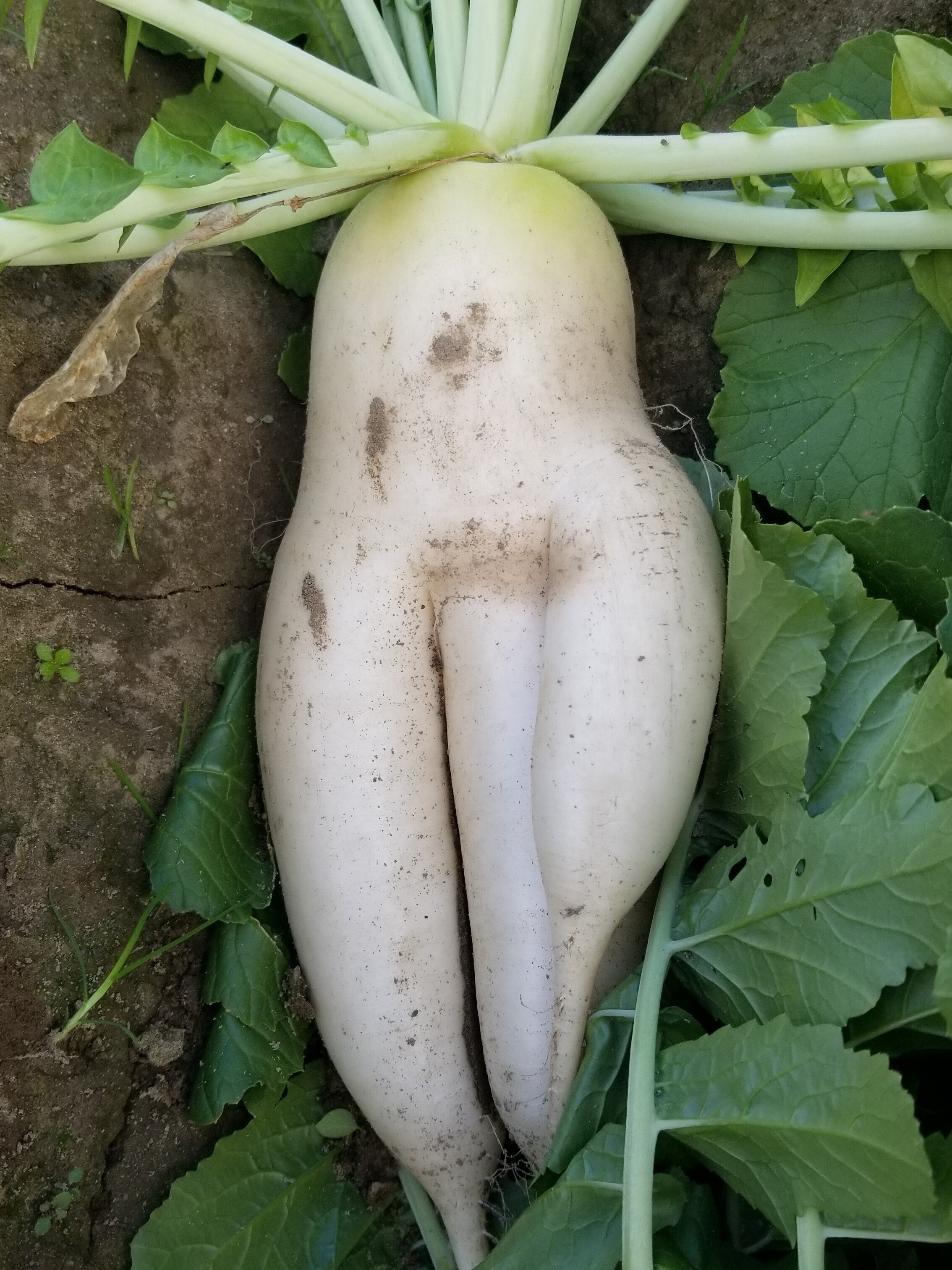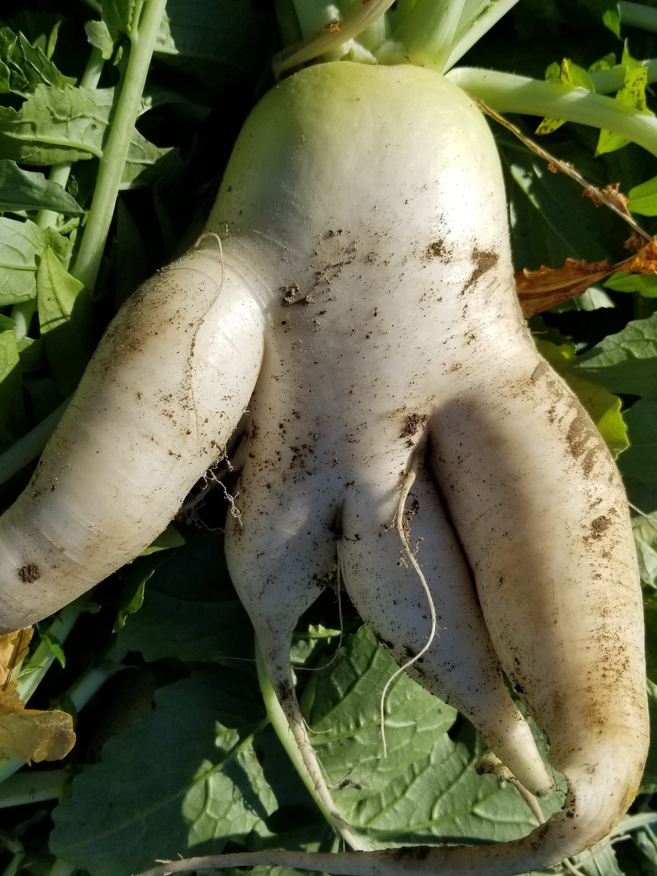 ダイコンの根っこの部分は、主根の生長点が損傷したときや、側根が肥大しすぎたりしたとき、太った根が複数に分かれたような状態になります。これを「岐根」と言います。