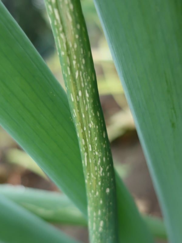 ボトリチス葉枯病が発生した葉っぱに見られるのが、たくさんの白い斑点。2~3ミリの小さな白い点がびっしりと表面に現れるのが特徴です。