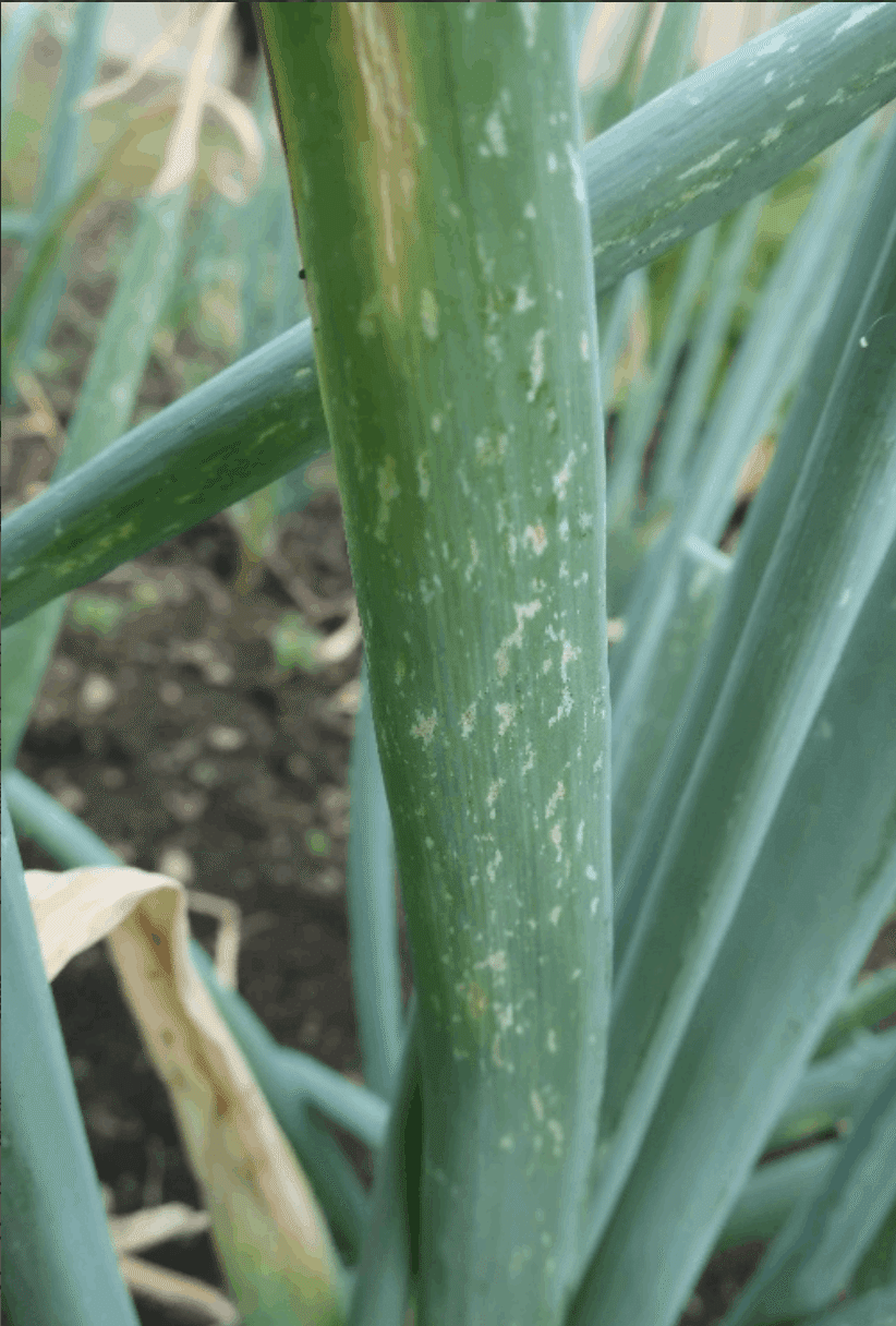 汁を吸われたネギの葉には、葉脈に沿ってカスリ状の白い点々が発生します。そして、次第にこの白い点が葉っぱ全体に広がっていきます。