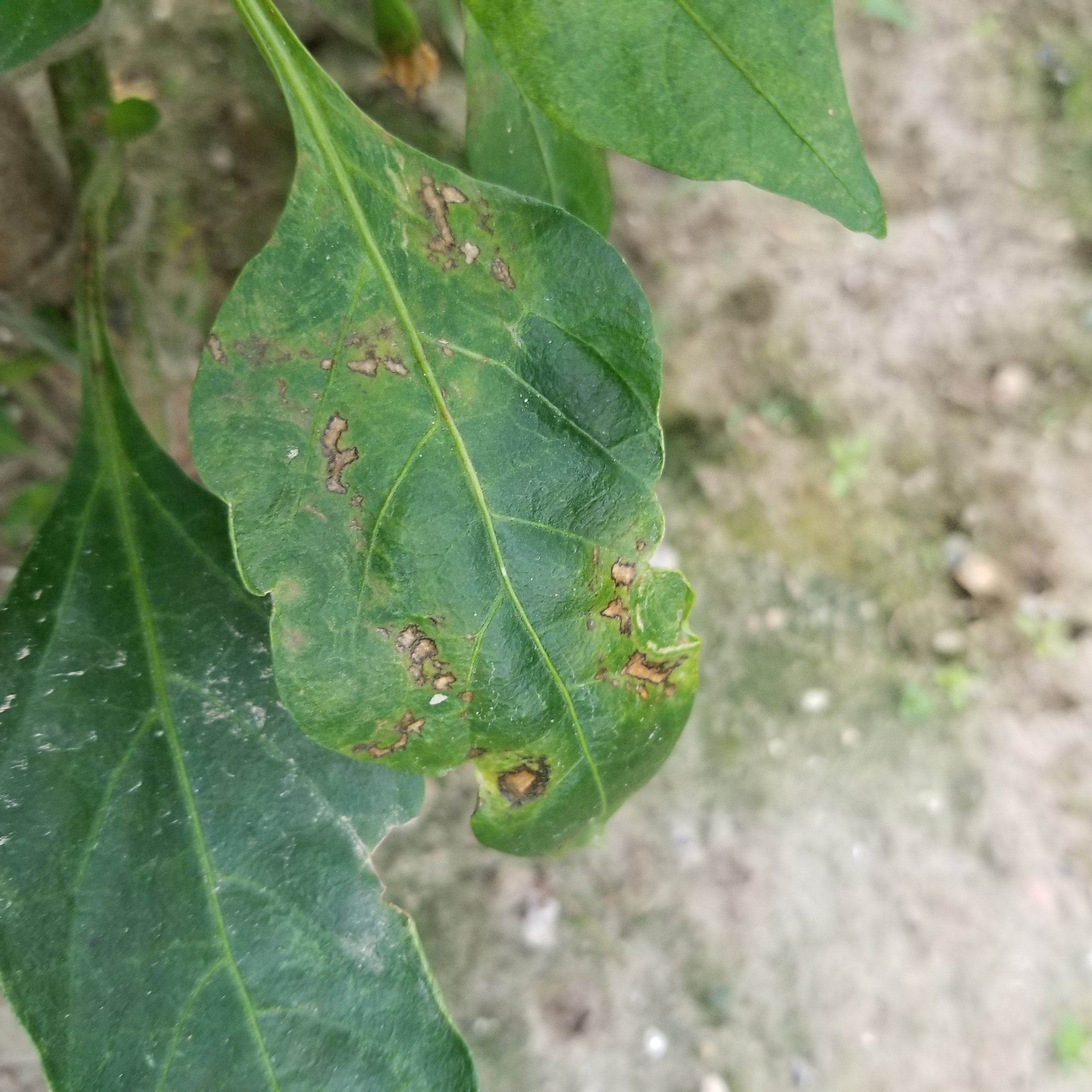 黄化えそ病にかかった葉には、緑色が薄くなった丸い斑点が出てきて、それがやがて大きな斑点になっていきます。