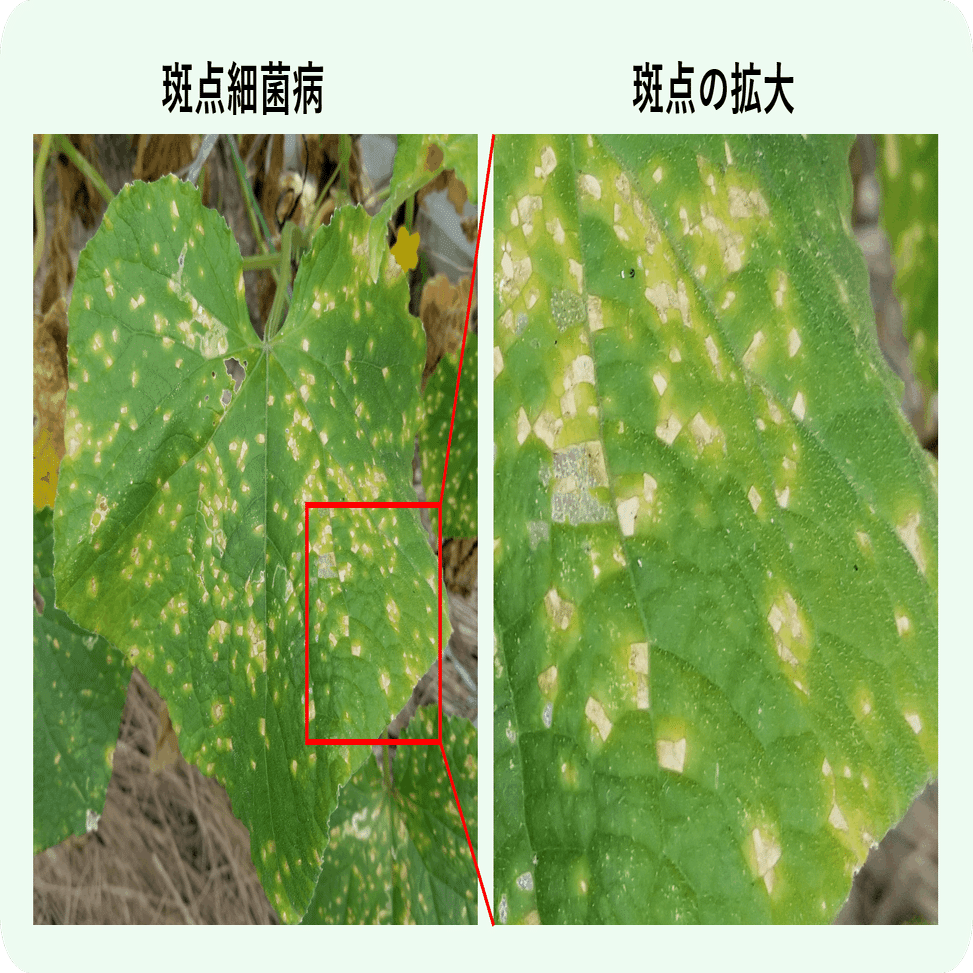 - 斑点のでき方 斑点細菌病はすぐに白い角ばった斑点が出る。べと病は、はじめうっすらと黄色くなってから徐々に白い斑点となる。
