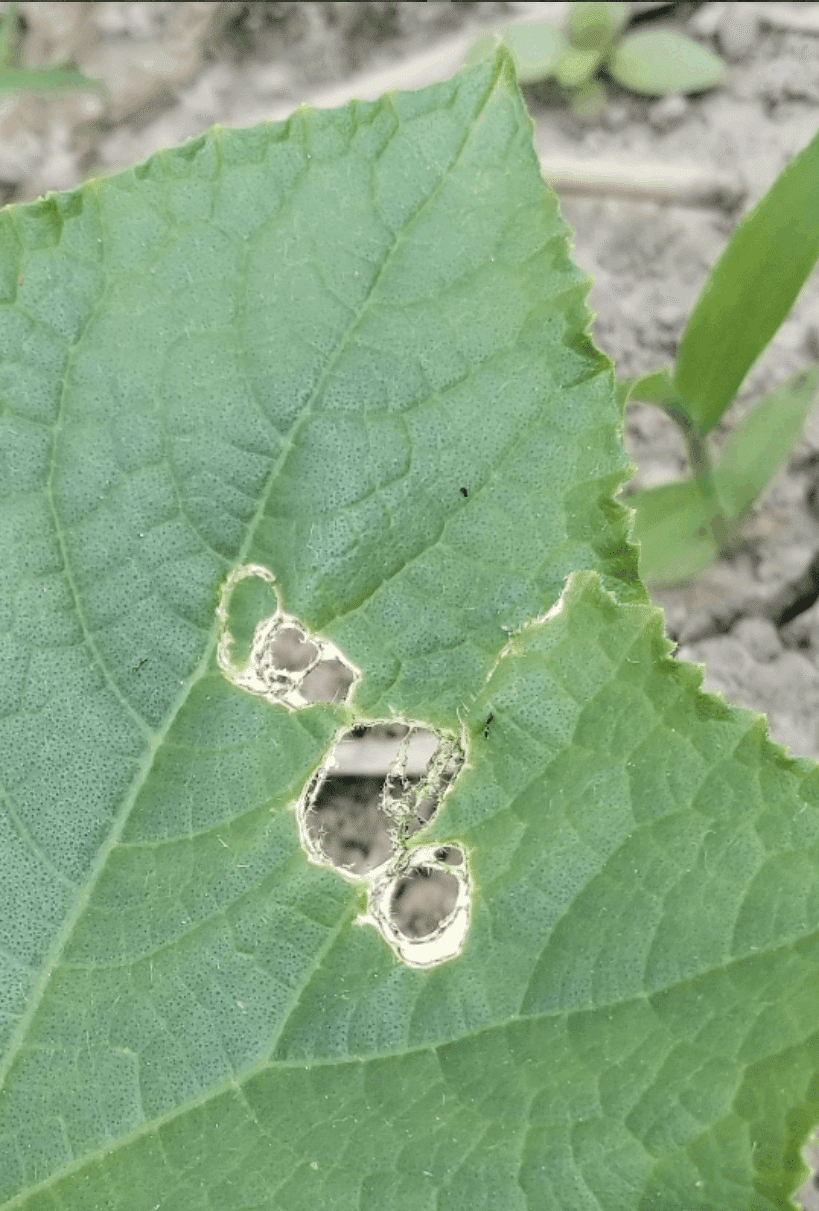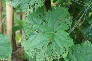 そして、ウリハムシの食害がたくさん出ると、葉っぱ全体が食い荒らさ、株が枯れてしまうこともあるので十分注意しましょう!