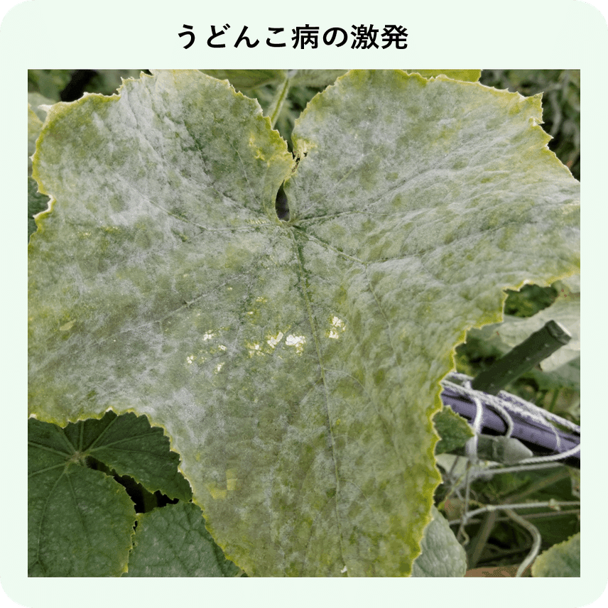 うどんこ病の菌は生きたきゅうりの上でしか生きられず、土壌からは伝染しません。それでも比較的発生しやすいのは、風などでどこからか胞子が飛んでくるからでしょうか…