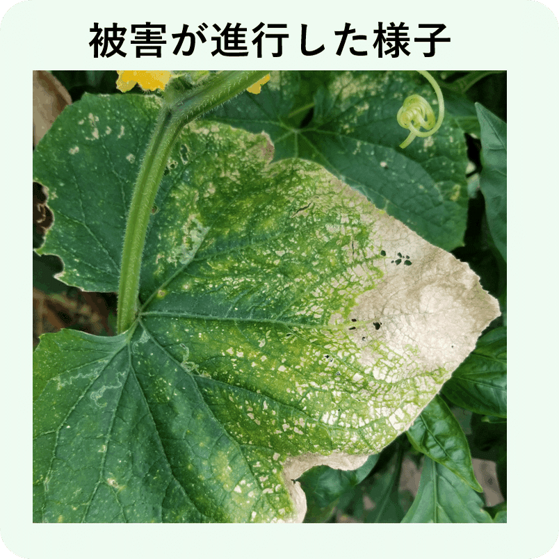 葉に白っぽい点が現れます。虫の姿が見えにくく、病気と勘違いしてしまうこともしばしば。葉の裏を見ると、体長1ミリ程度の小さな虫が動いていて、それがアザミウマです。葉の成長が阻害されること、光合成がしにくくなることで、キュウリの元気が奪われてしまいます。