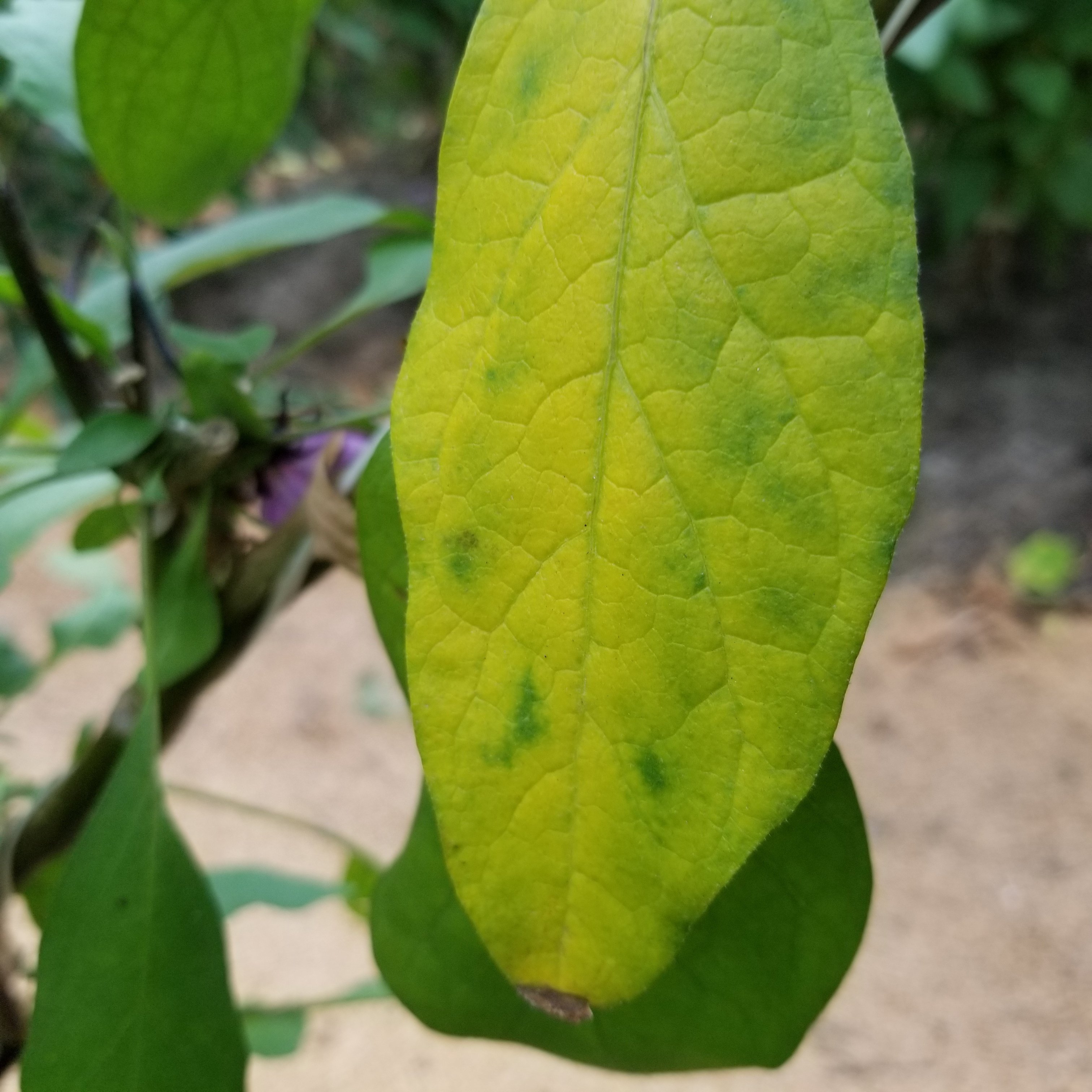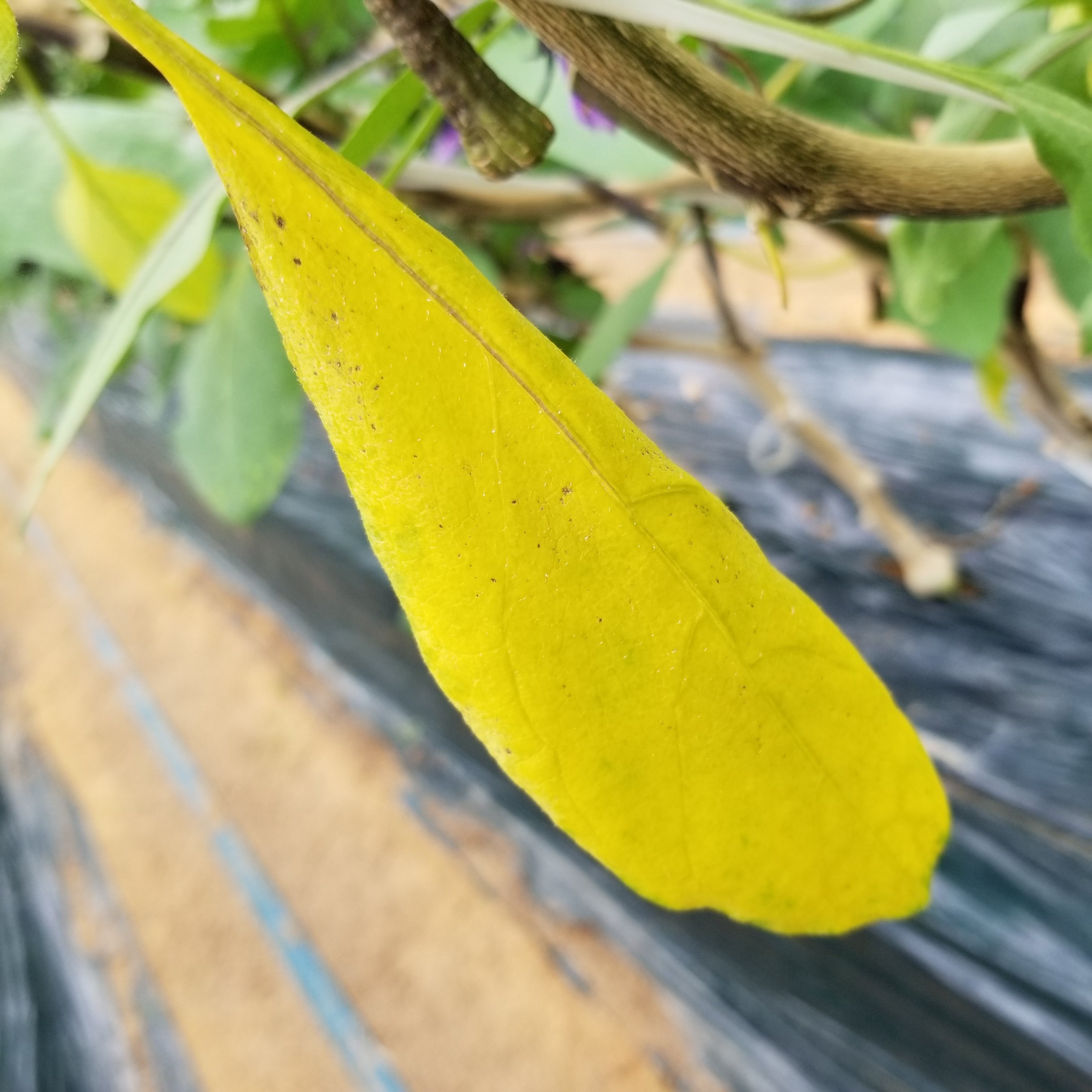 この状態になると、なすの葉っぱ全体が黄色に変色します。写真を見ると、普通は緑色をしている葉っぱが、明らかに黄色に変わっているのがよーく分かると思います!