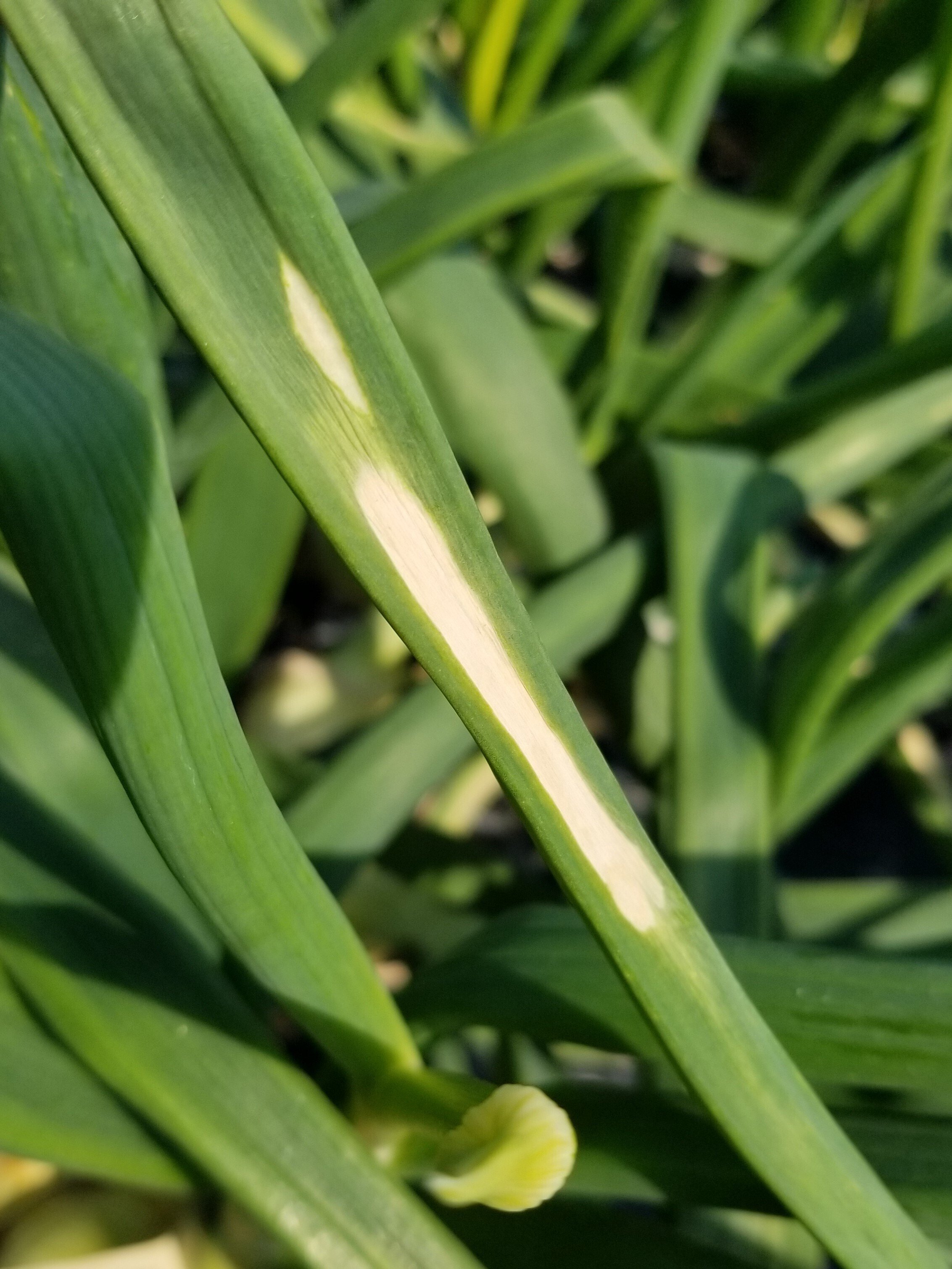 白色疫病になったタマネギの葉は、まずはじめに薄緑色に変色します。そこから次第に白い斑点になっていきます。やがて葉っぱの全体に広がっていき、最終的には病斑によって葉が折れ曲がることが多いです。