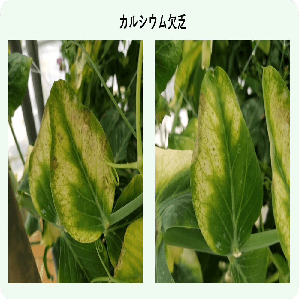 家庭菜園でスナップエンドウを栽培していると、葉の色が黄色くなることがあります。これは葉にカルシウムが欠乏することによって生じる生理障害です。