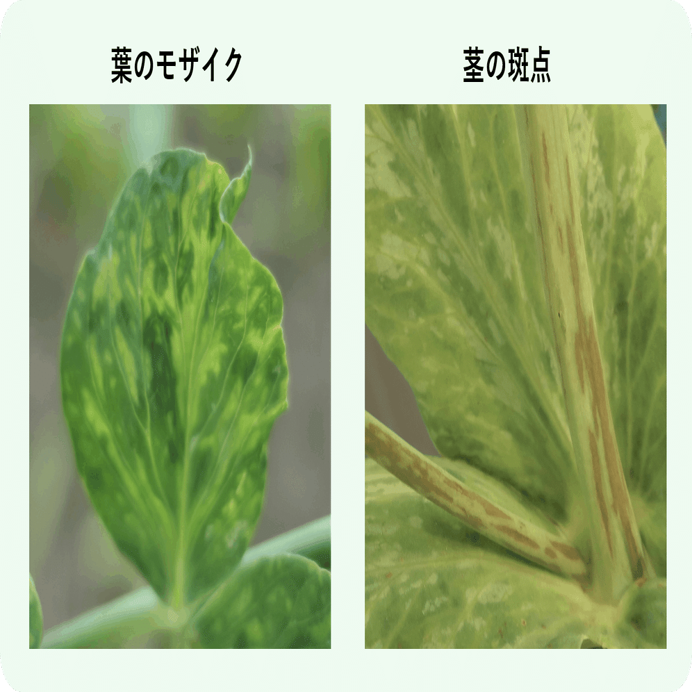 キュウリモザイクウイルス(CMV)、ソラマメウイルトウイルス(BBWV)、インゲンマメ黄斑モザイクウイルス(BYMV)などのウイルスによる病気です。