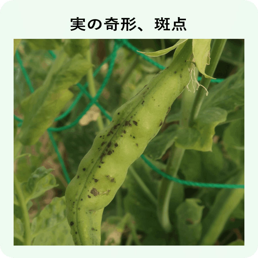 症状が激しくなると、きれいな形のスナップエンドウの収穫が困難に。
