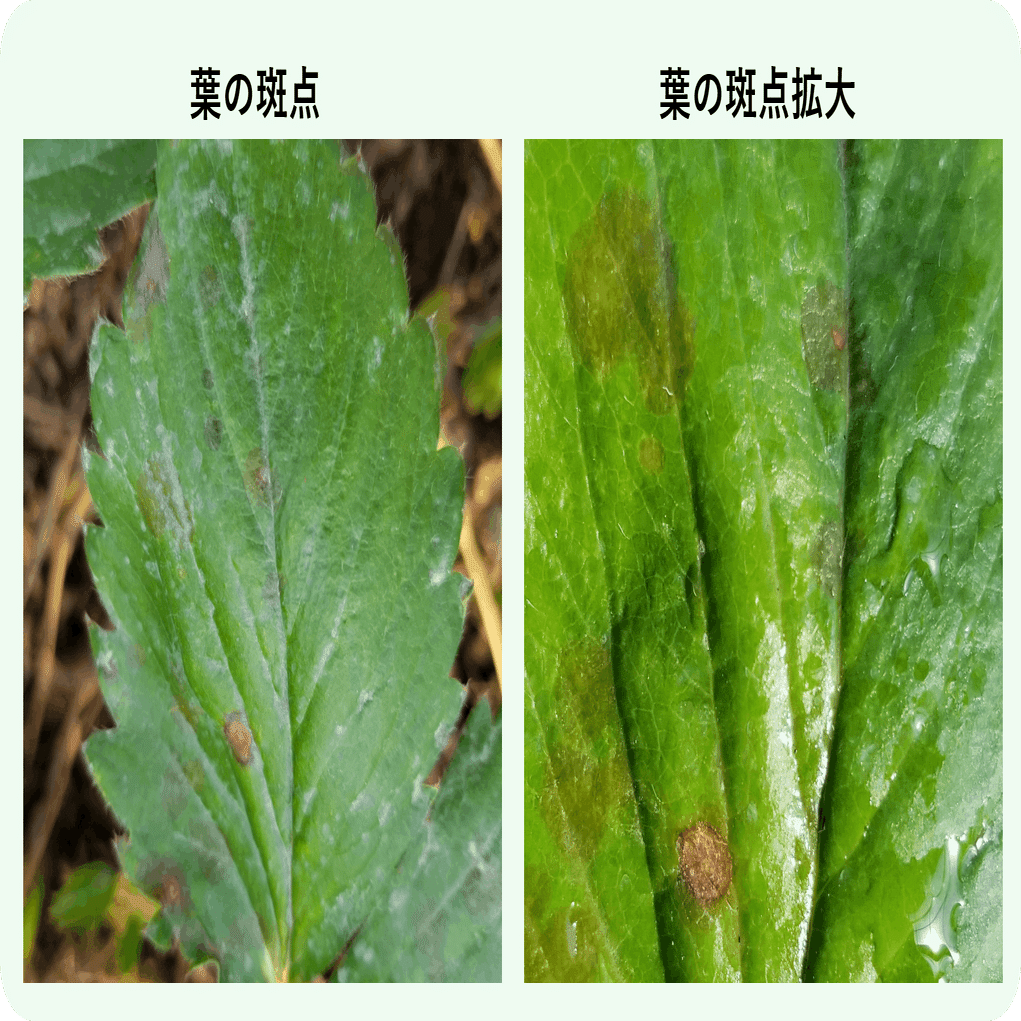 ときどき葉・実・ランナーに症状が出ます。葉には透き通った灰色の斑点、実やランナーにはどす黒い斑点となり、湿度が高いとサーモンピンクの胞子が発生します。