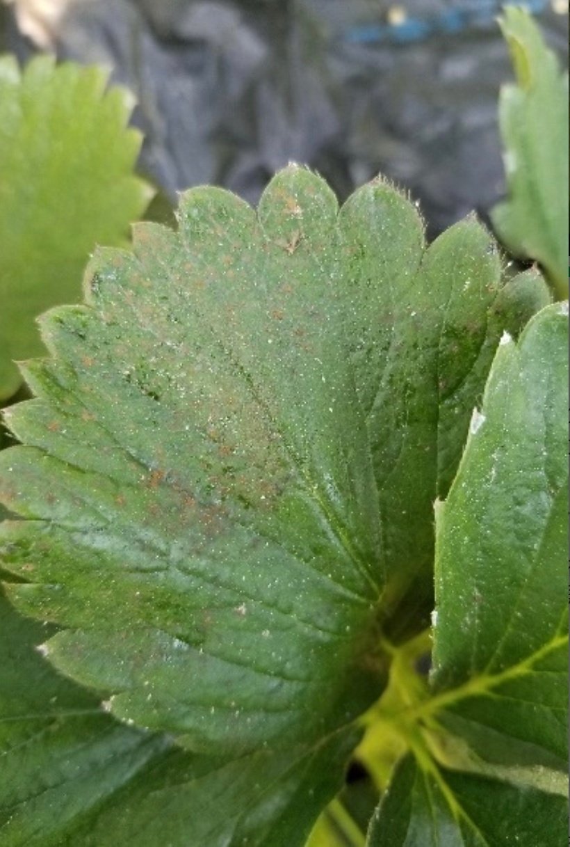 分泌物で覆われて煤(すす)が発生したいちごの葉