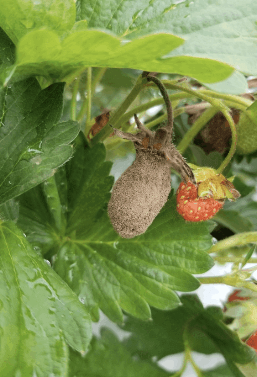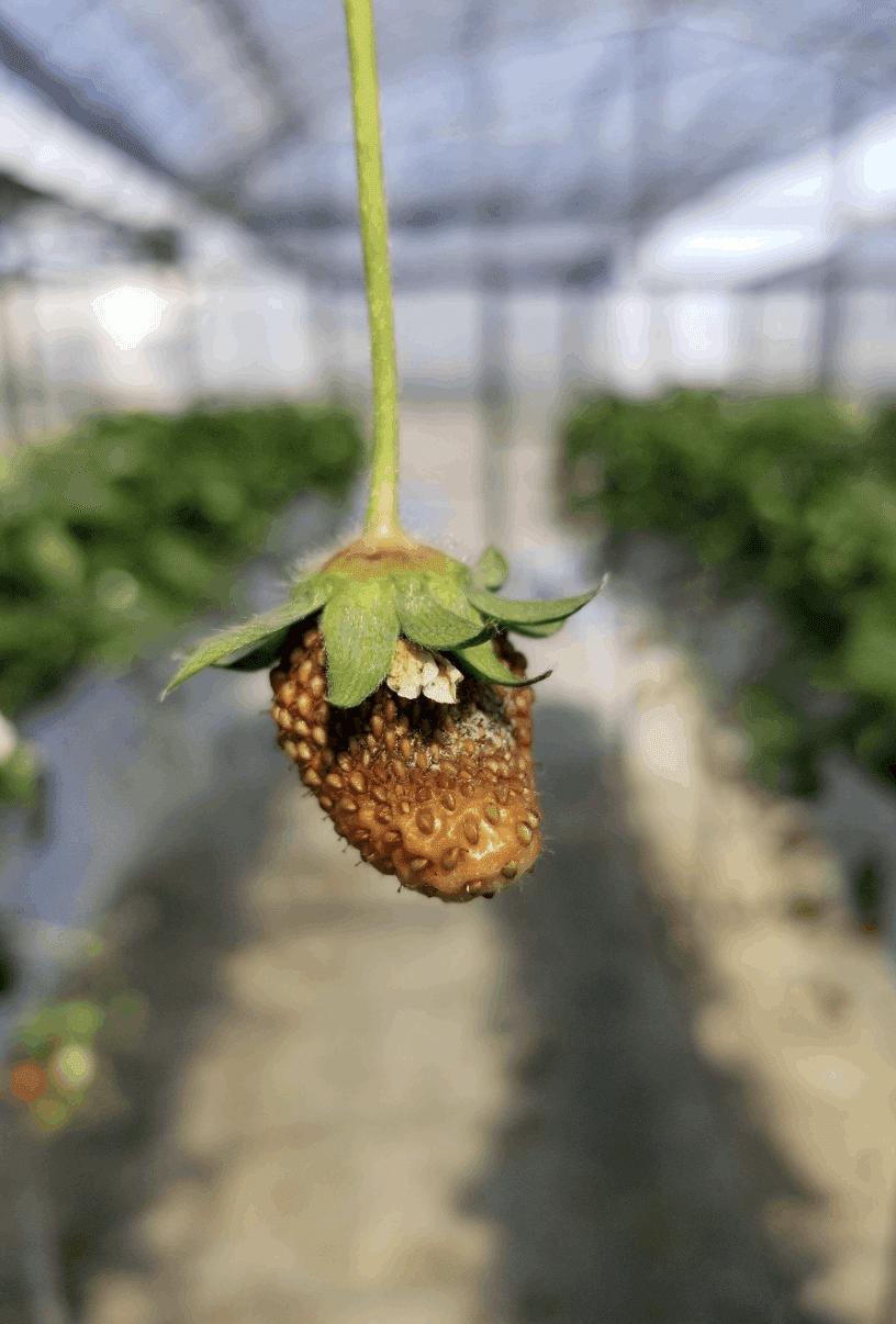 灰色カビ病とは、かびの一種である「Botrytis cinerea Persoon(糸状菌)」によって起きる、いちごの実に発生する病気です。