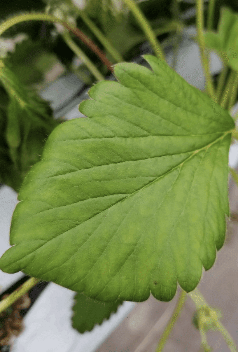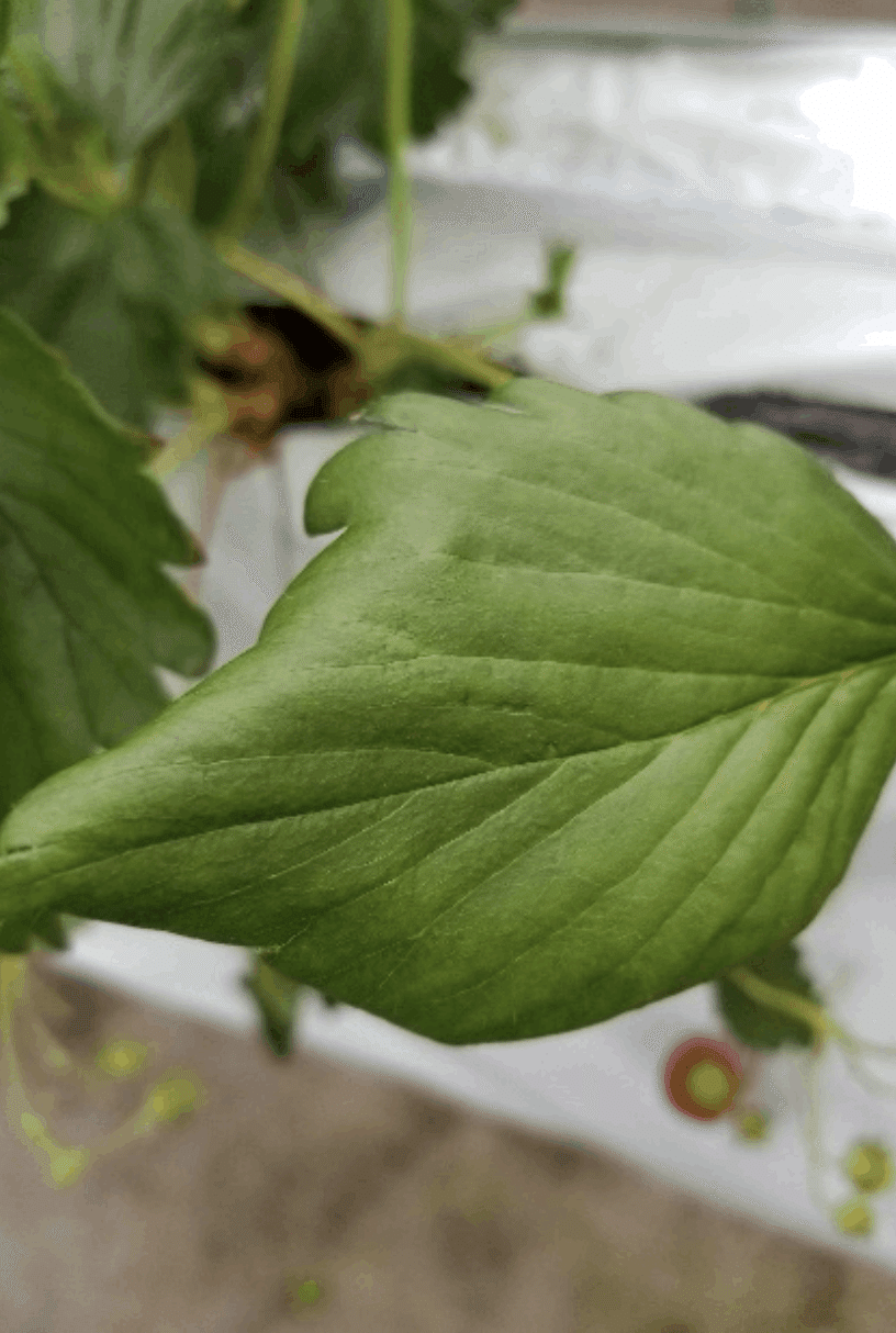 いちごの水不足は、土壌の乾燥によって、葉に十分な水が行き渡らないことで起こります。水不足が深刻になると、下の写真のように葉っぱの先がしおれてくるのがポイントです。