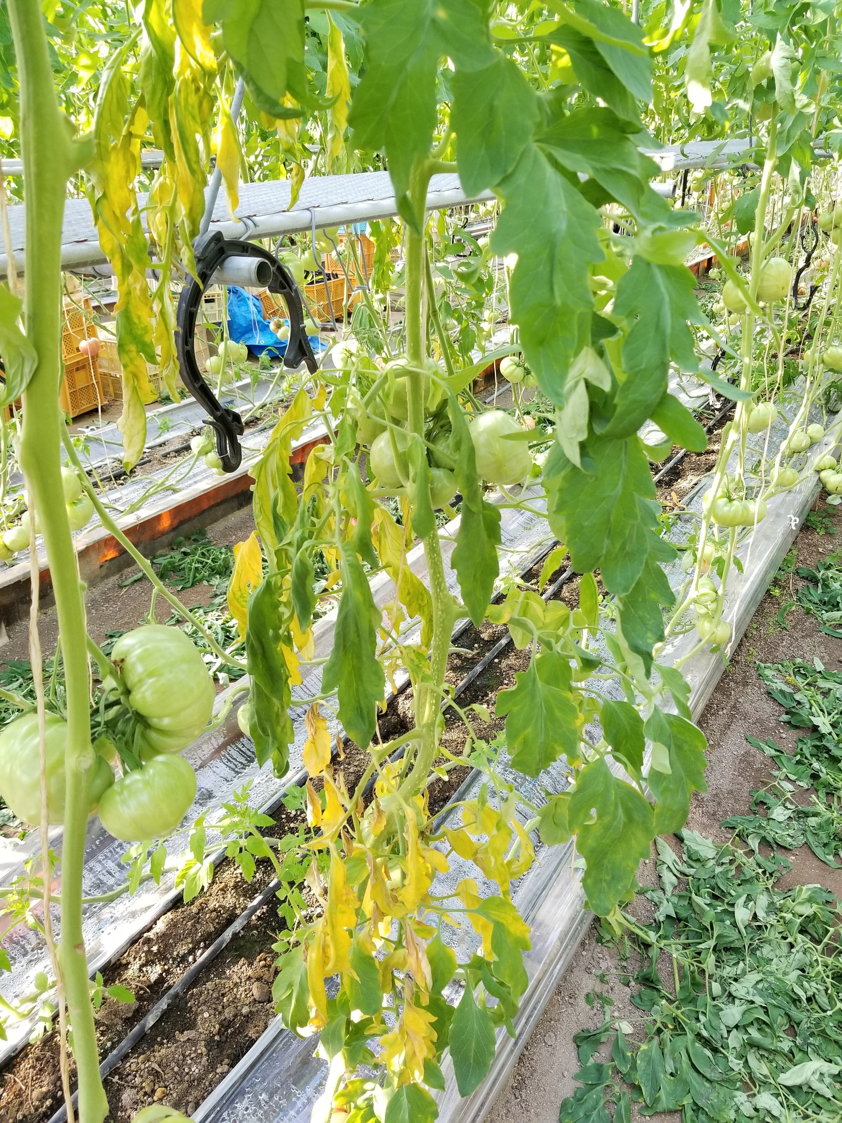 トマトに萎凋病が発生すると、はじめはトマトの株の下葉が、昼間にはしおれ、夜になると回復することを繰り返し、やがて黄色になって完全にしおれてしまいます。