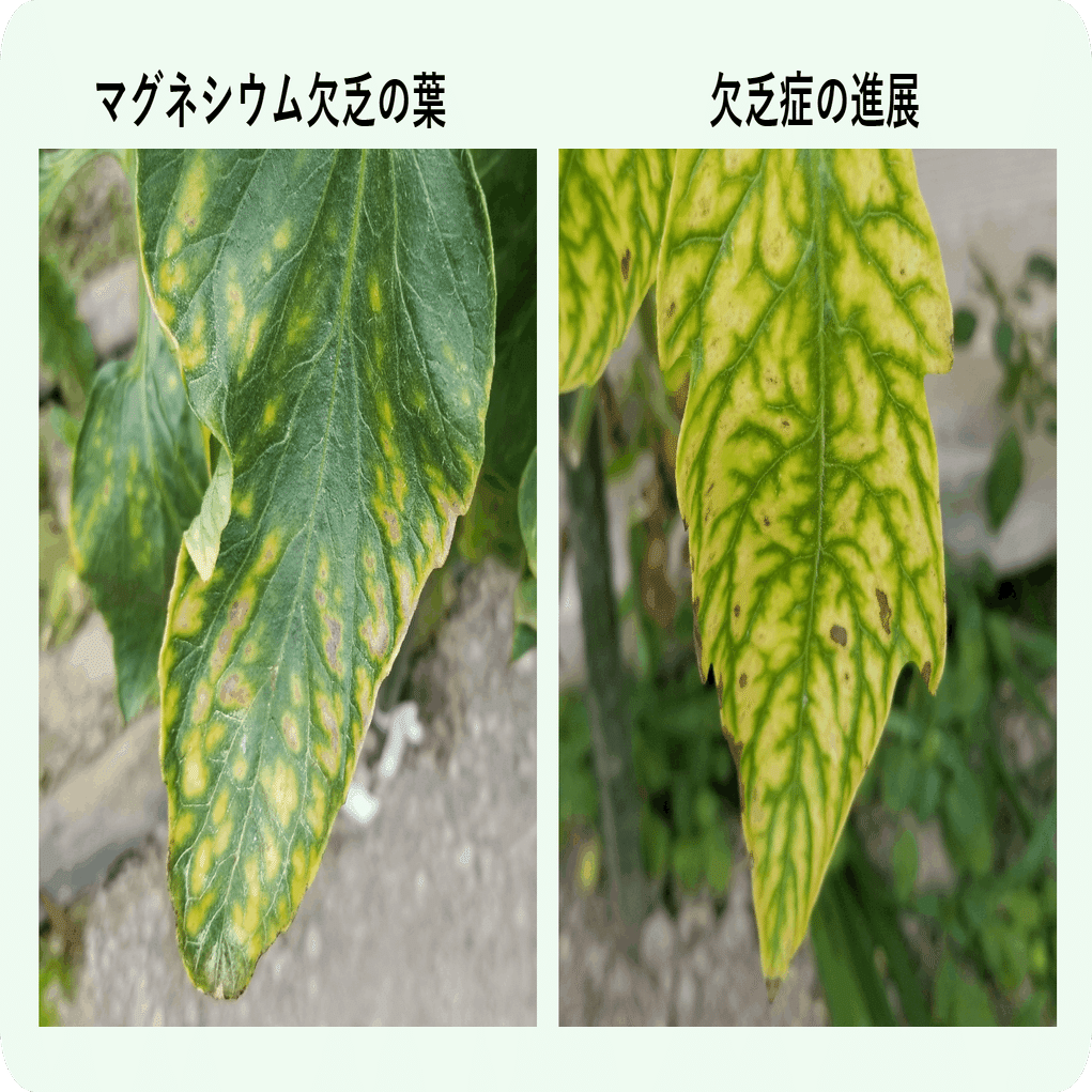古い葉に症状が出るのは、マグネシウムの植物体内での移動が早く、成長スピードの早い成長点付近に移動してしまった結果、古い葉で不足するからです。