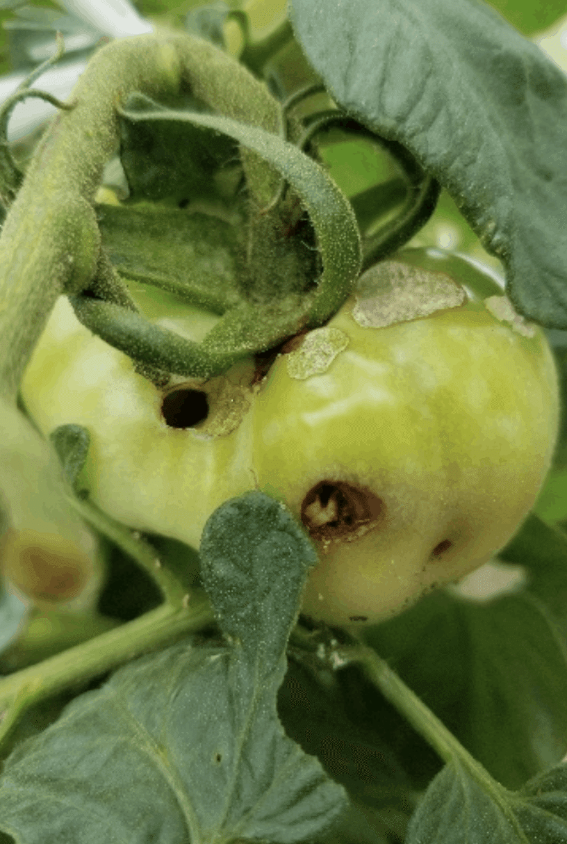 タバコガの被害は、とにかく葉っぱや実を食い荒らしてしまうこと。写真のように、実が穴だらけの状態になることも珍しくありません。