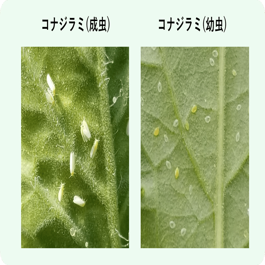 コナジラミは見つけにくいですが、早期発見、退治をすることで黄化葉巻病の予防にもなります。白い小さい虫が飛んでいるな、と思ったら要注意!